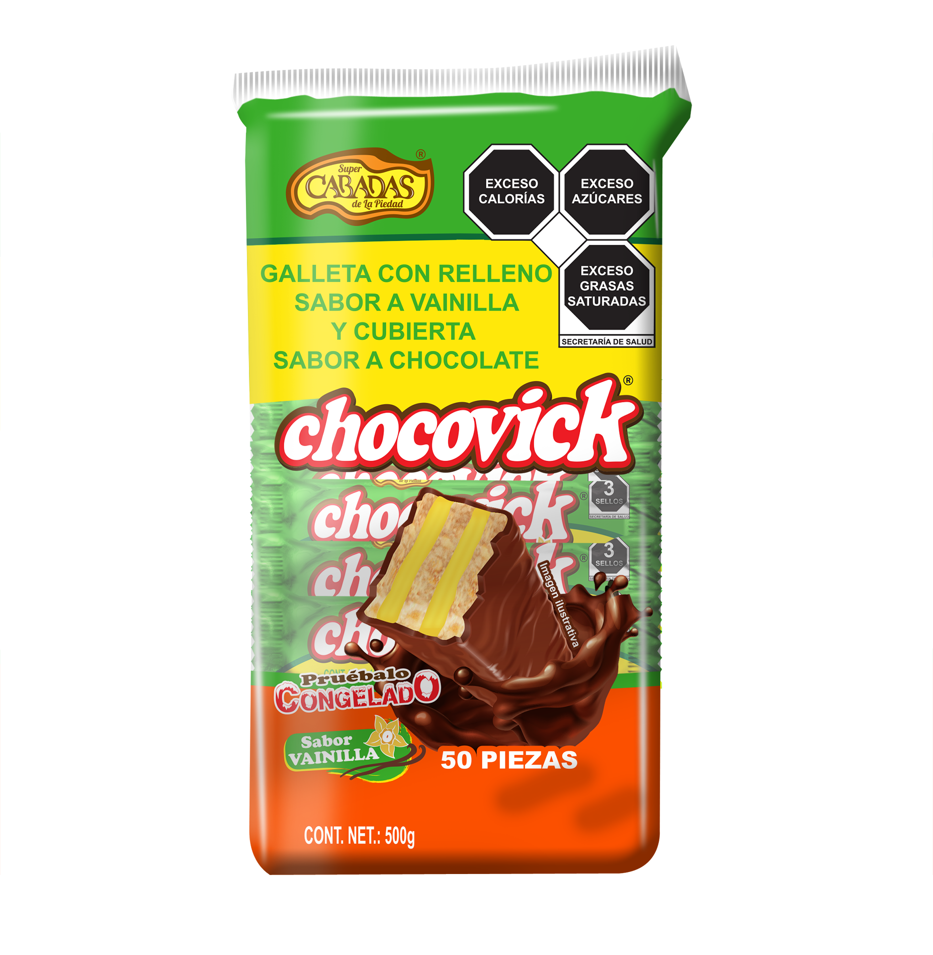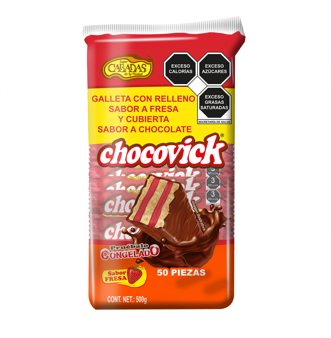 Una irresistible galleta rellena de suave merengue con sabor fresa o vainilla, cubierta con una capa de delicioso chocolate que la hace aún más especial.